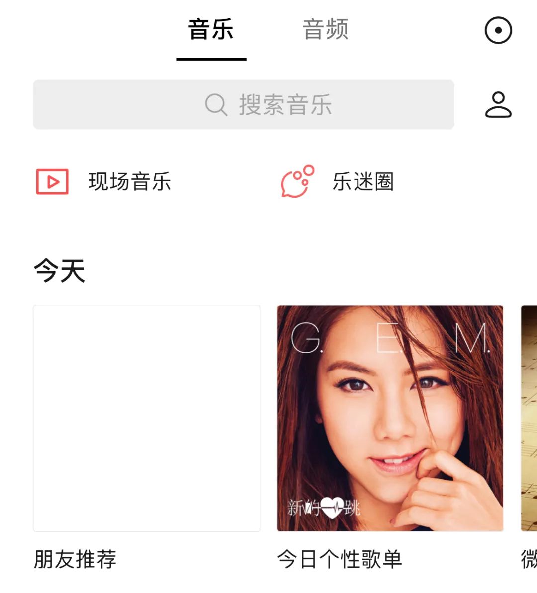 先说音乐赛道。点开“听一听”中的“音乐”选项,下方首先出现的是“现场音乐”和“乐迷圈”,这两项功能均与视频号深度绑定。