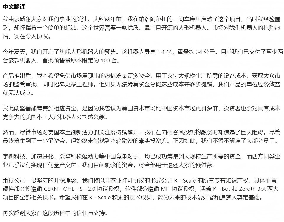 公司将进行全员裁撤、全额退还所有机器人K-Bot定金,并一次性开源全部专有技术。这封邮件,标志着这家成立不足一年的机器人初创公司进入终局。