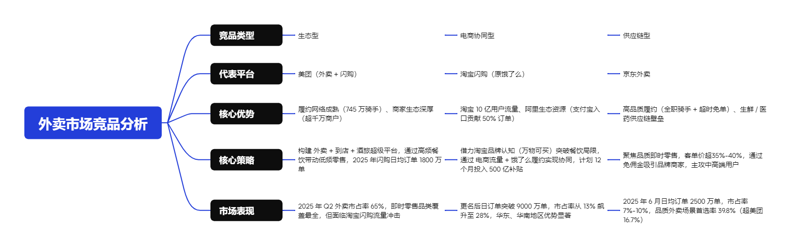 从价格战到生态战:早期外卖市场的客单价内卷(中式快餐客单价从 25.2 元降至 24.4 元)已难以为继,头部平台开始比拼 “供应链 + 流量 + 履约” 的综合能力。美团构建 “外卖 + 到店 + 酒旅” 生态,京东依托供应链做 “品质即时零售”,阿里则通过淘宝闪购整合 “电商流量 + 饿了么履约”,竞争维度全面升级。