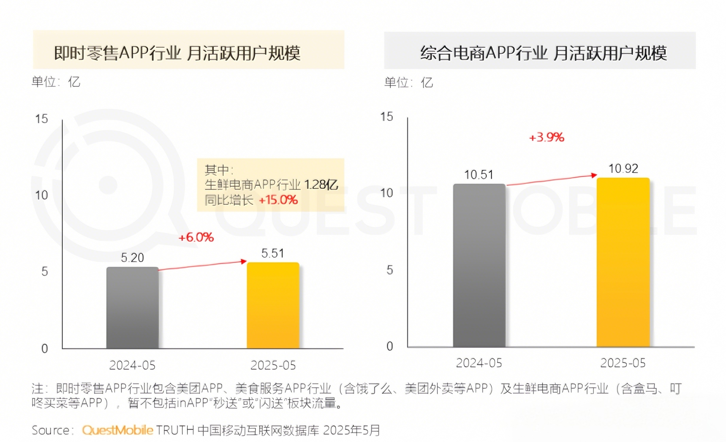 根据 QuestMobile 2025 年 5 月发布的即时零售行业流量报告,国内即时零售 APP 月活跃用户已突破 5.51 亿,其中生鲜电商细分赛道月活达 1.28 亿,同比暴涨 15%,成为零售业增长最迅猛的赛道。