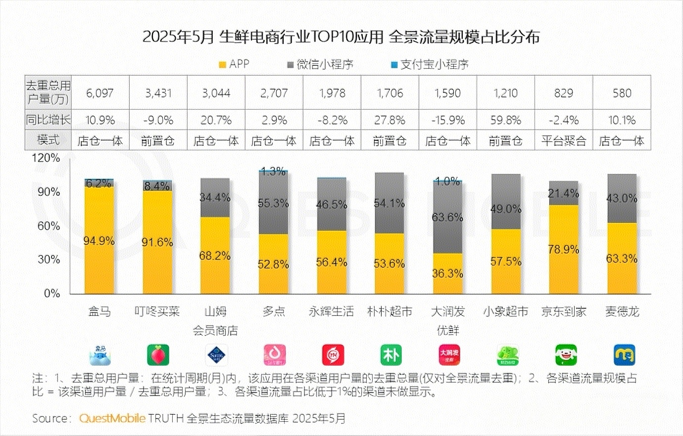 而在 “前置仓自营模式” 阵营中,叮咚买菜、朴朴超市、小象超市形成三足鼎立格局 —— 截止 2025 年 5 月,三者去重用户总量分别为 3431 万、1706 万、1210 万,同比增速呈现差异化表现:小象超市以 59.8% 的增速领跑,朴朴超市增长 27.8%,叮咚买菜则同比下滑 9%。