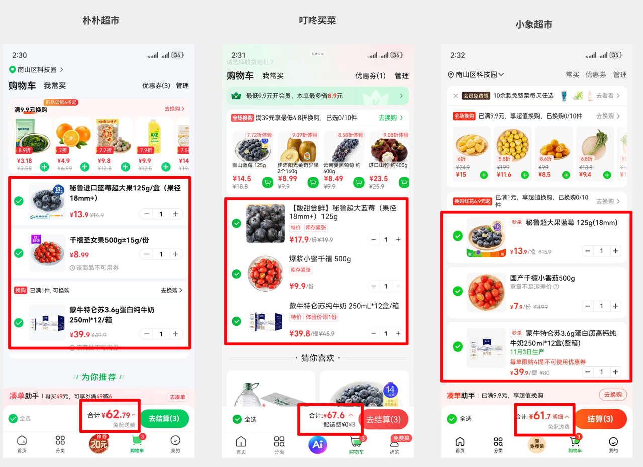 关于定价,加购同样大小规格的秘鲁125g蓝莓、500g千禧圣女果、蒙牛特仑苏纯牛奶,实付价格略有差异,小象超市更胜一筹。