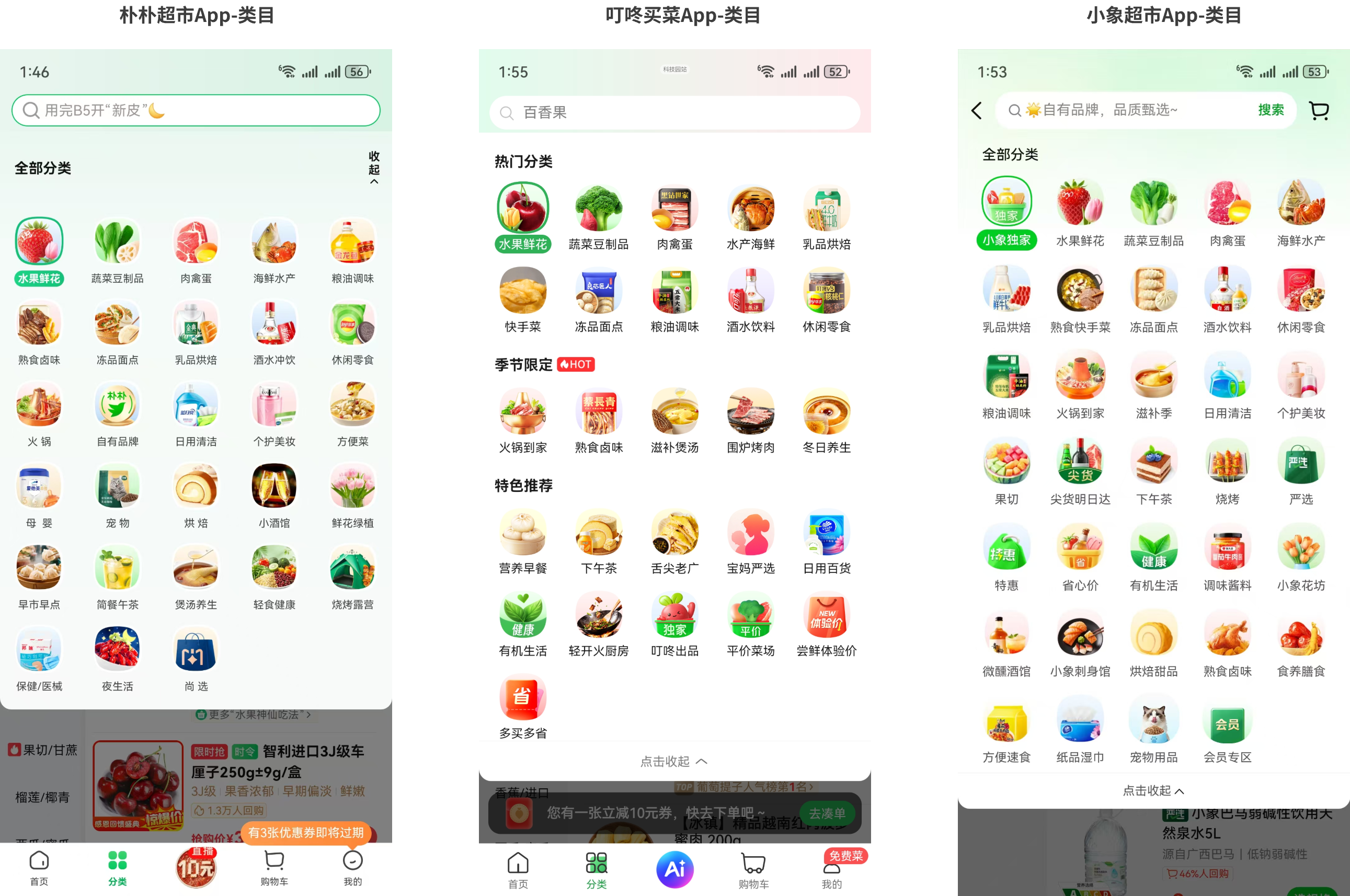界面与下单:从 “用户旅程地图” 分析,三者均支持 “一键复购”,但设计逻辑不同:朴朴超市分类更清晰,老年用户也能快速找到生鲜区,是 “适配中老年用户” 的交互优化,符合其 “社区便民” 定位;叮咚买菜的 “菜谱推荐 + 食材一键购” 功能实用,适合厨房小白,是 “场景化引导消费” 的产品设计,提升客单价;小象超市嵌入美团 APP 首页入口,账号互通,不用额外注册,是 “生态流量复用” 的核心优势,新用户转化率比行业均值高 40%;