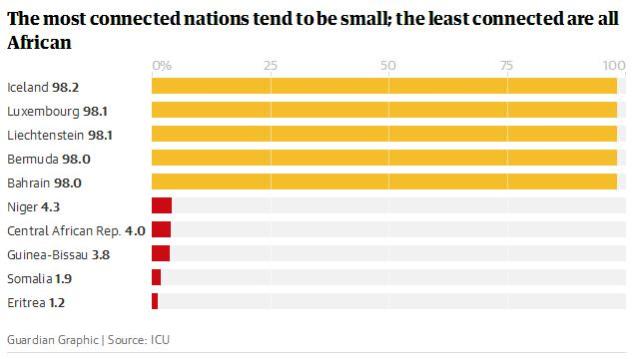 但是很多地方没有跟上步伐。在坦桑尼亚、乌干达和苏丹,大约有30-40%的人可以上网。在几内亚、利比里亚和塞拉利昂,只有7%到11%的人能上网。在厄立特里亚和索马里,只有不到2%的人可以联网。