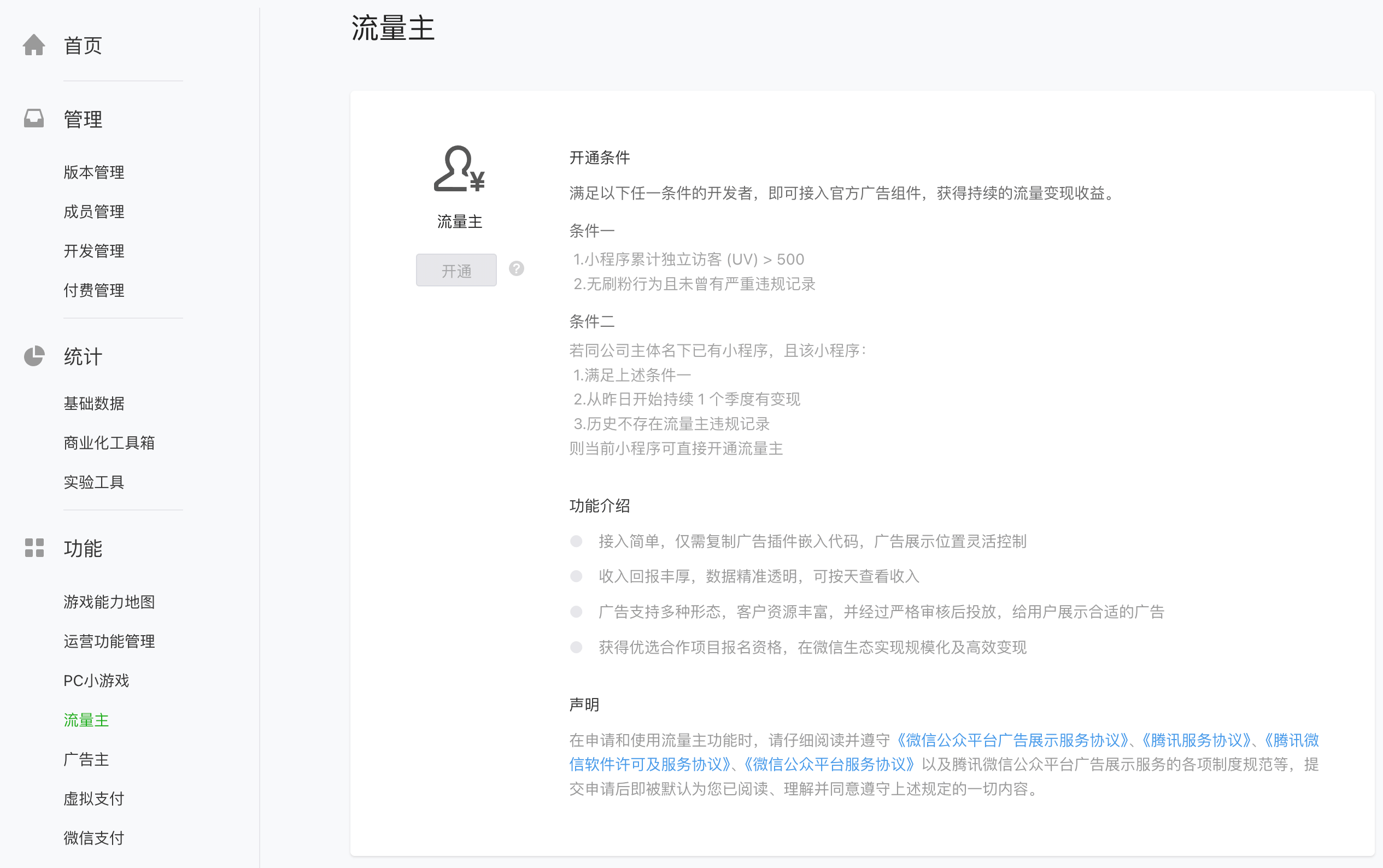 登录 https://mp.weixin.qq.com 管理后台,点击“功能”-“流量主”板块