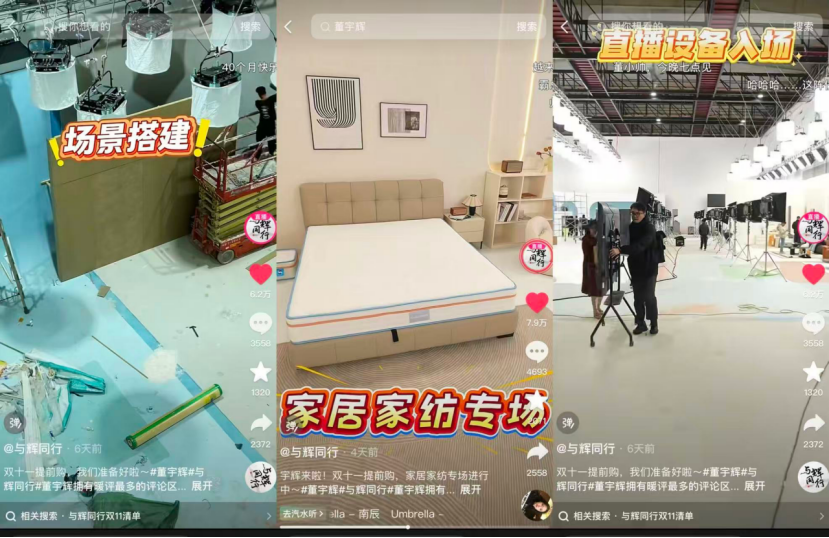 他搭建了一个双11“大卖场”,偌大的场馆内,沙发、床、冰箱等家纺家电产品依次摆放着,灯光架起,摄像机就位。这是董宇辉为特地为双十一准备的直播现场。