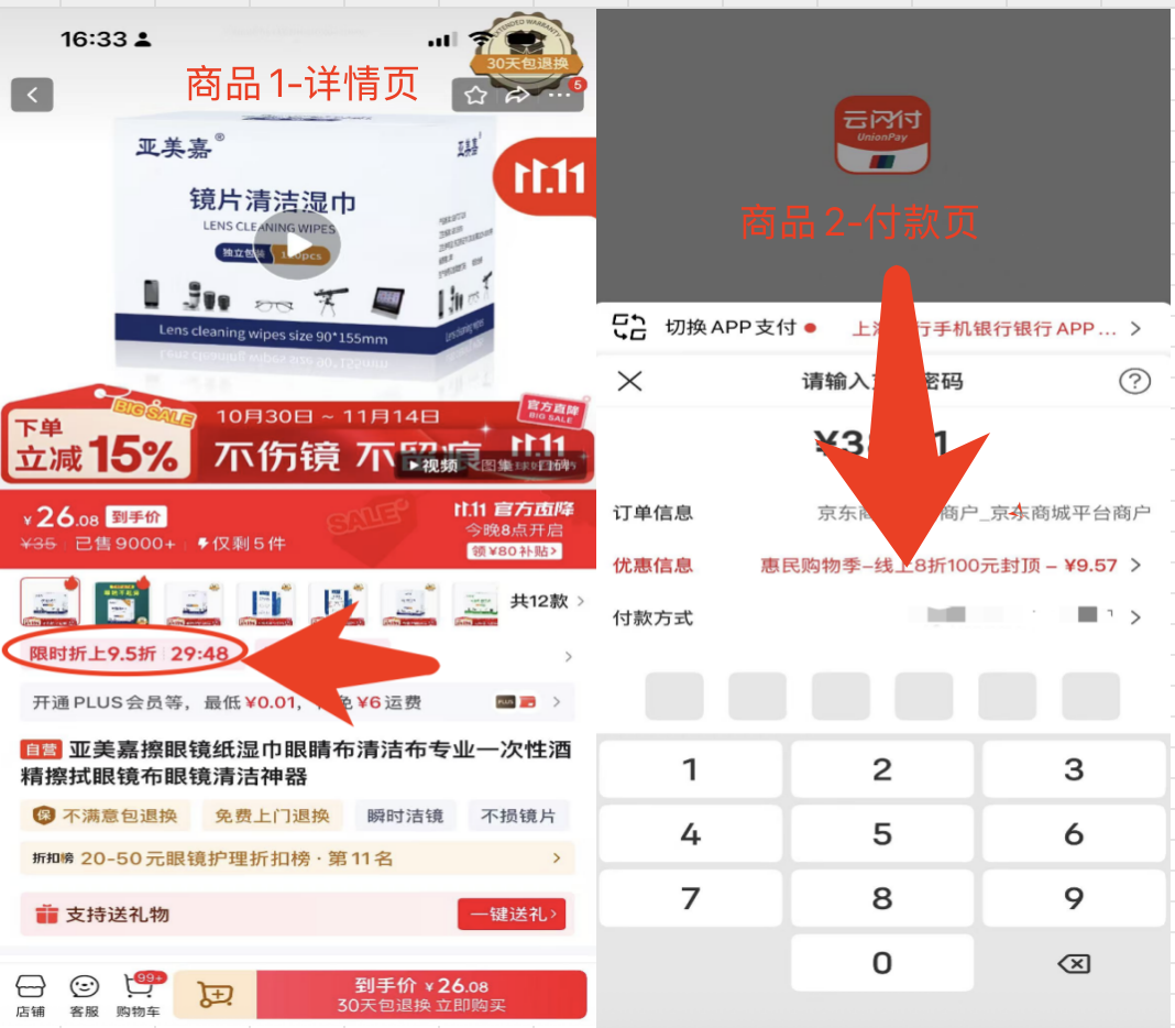 京东的操作是选择在商品详情页加入了时效性压迫感极强的30分钟限时折扣,猜测与用户加入购物车时长与用户点击但不付款的次数有关,京东给这类想买但是仍犹豫的顾客加推优惠,顾客看到又降价后从欣然付款,这点跟购后的召回用券本质一样,都属于定向促活。