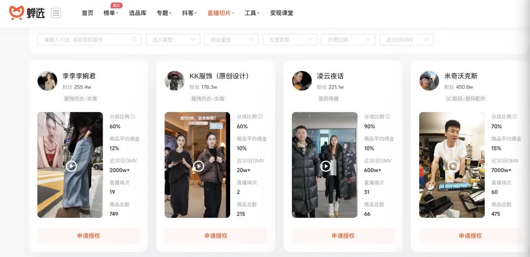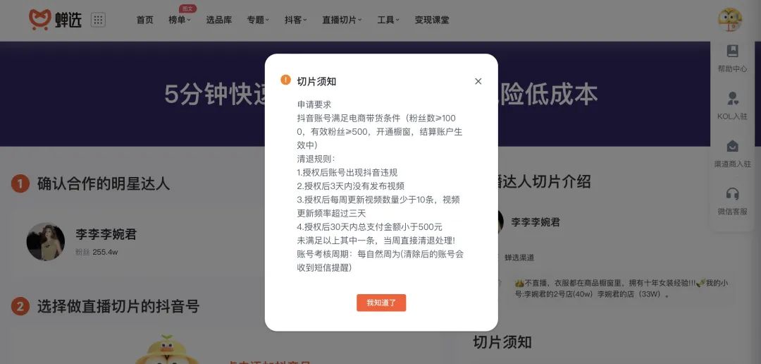 不过,做切片并不是躺赚,蝉选平台贴出声明,要求申请切片的抖音账号粉丝数超过 1000,有效粉丝超过 500 并开通橱窗,而且如果授权后 30 天内总支付金额少于 500元,还会被清退。