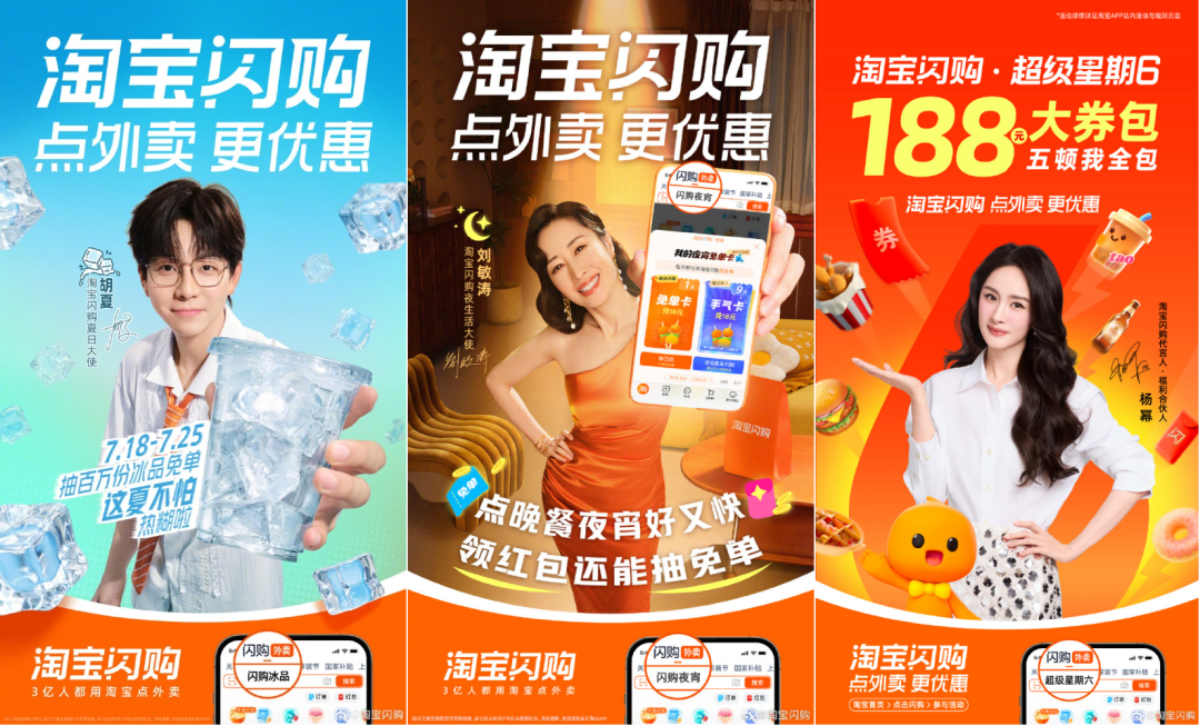 卷价格是主线,卷明星代言则成为这场持久战的副本。美团外卖签了黄龄、孙颖莎、陈哲远等明星;京东外卖找了雷佳音、张艺兴、李晟等明星。淘宝闪购陆续签了汪苏泷、吴艳妮、杨幂、李现等20多个明星。在明星代言的商战中,淘宝闪购主打一个“谁火签谁”(有热播作品或是人气持续上升),以短代的形式借助明星人气和热度完成“淘宝闪购”的品牌和低价优势曝光。