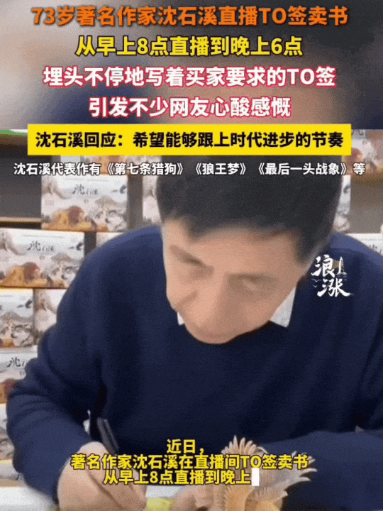 比如,近期73岁的著名作家沈石溪走进直播间,从早上8点一直播到晚上6点,埋头为读者写TO签卖书。面对网友的心疼,他表示:“希望能够跟上时代进步的节奏。”